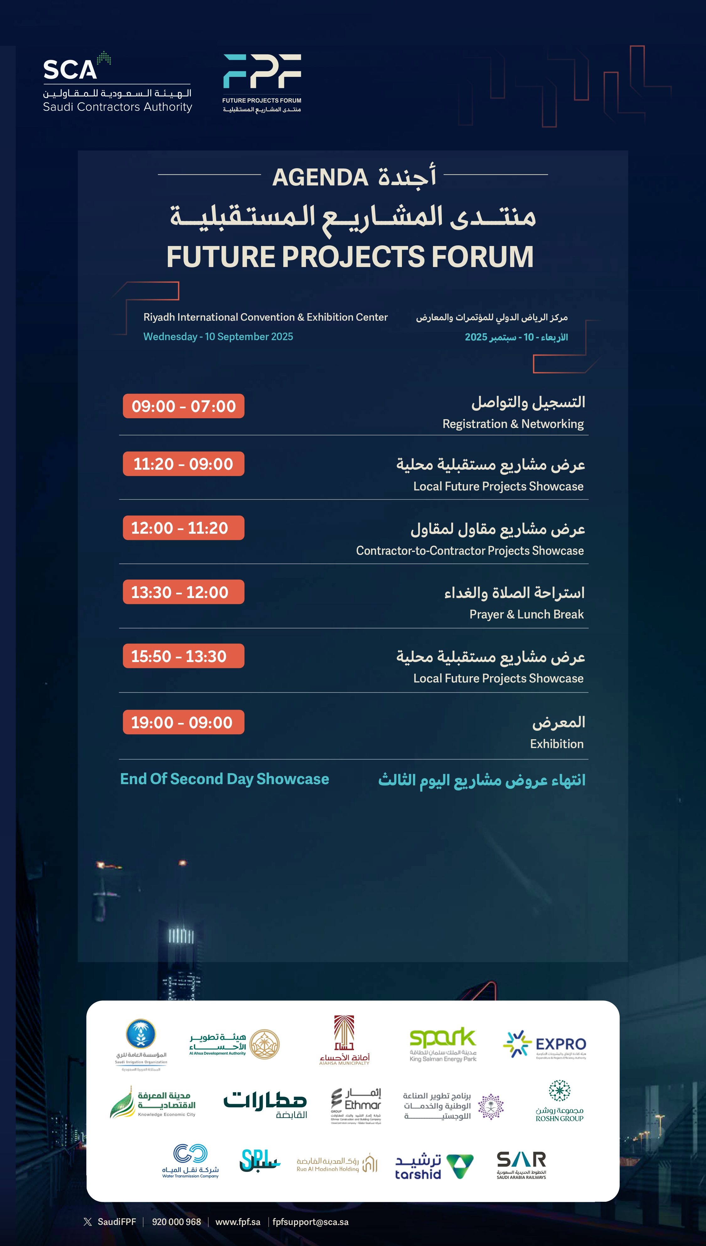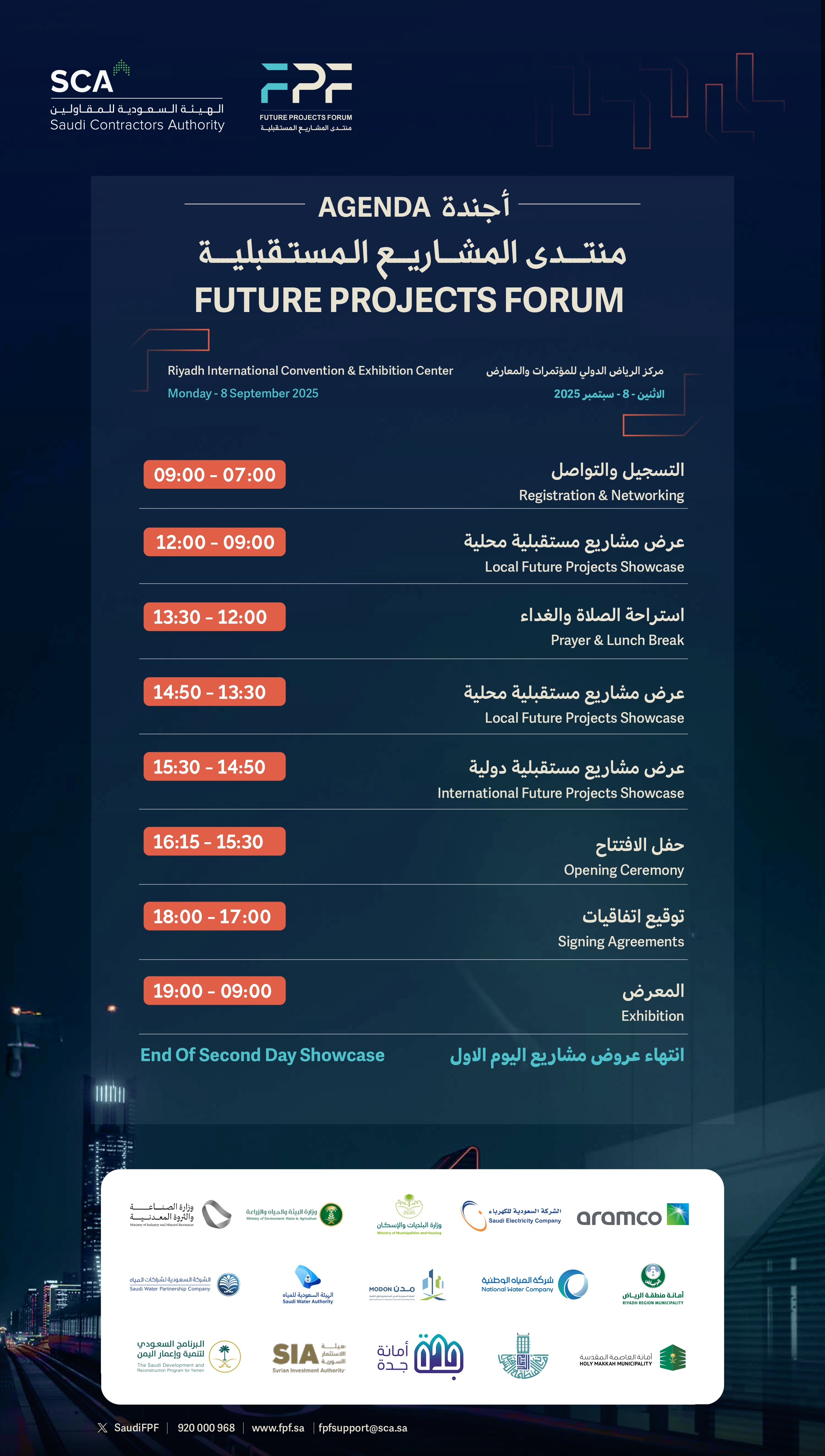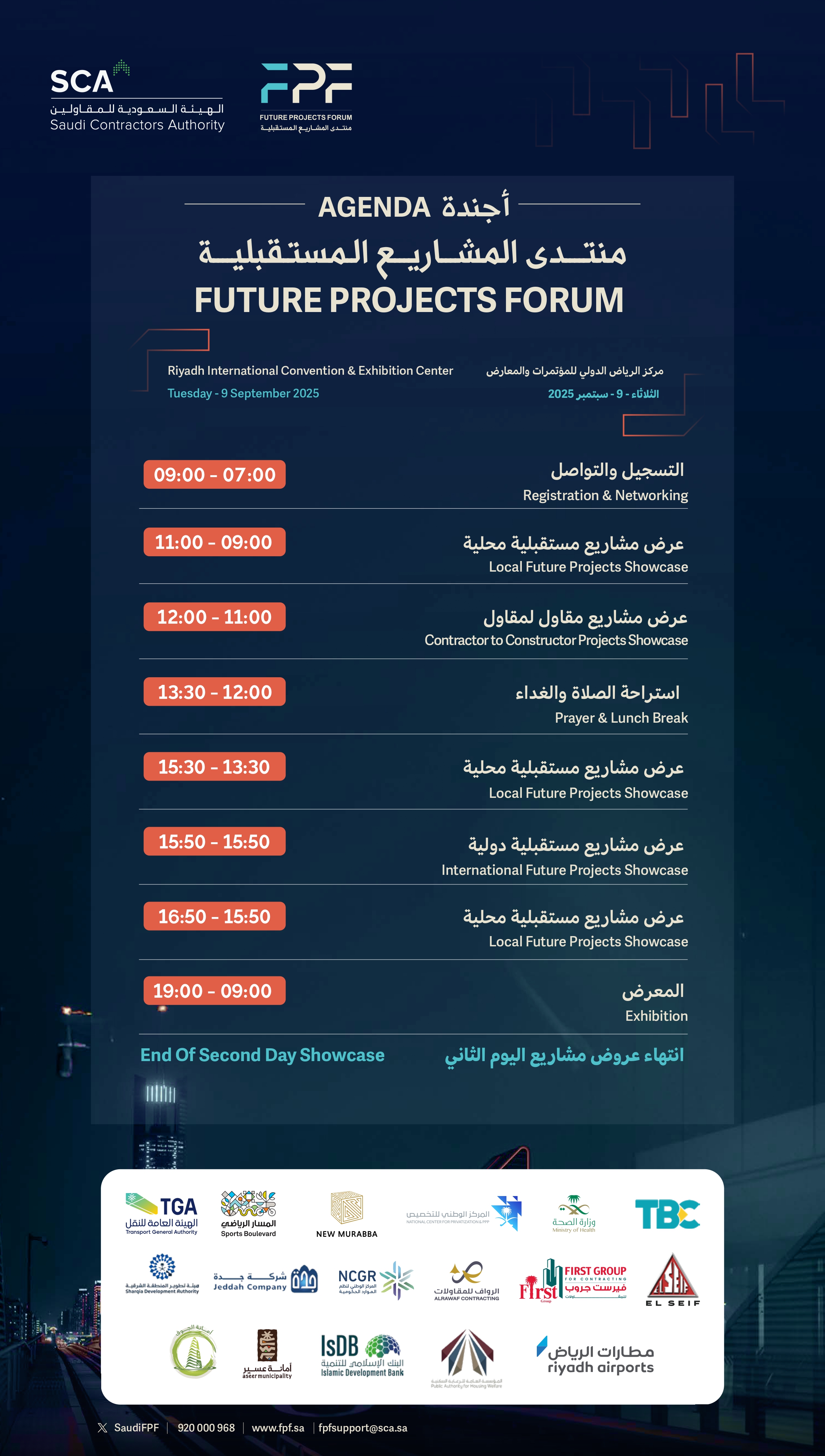The Future Projects Forum, in its new and larger edition, will take place in December 2026 , at the Riyadh International Convention and Exhibition Center. The event will witness an increase in both local and international attendance, with a diverse range of projects and accompanying activities.